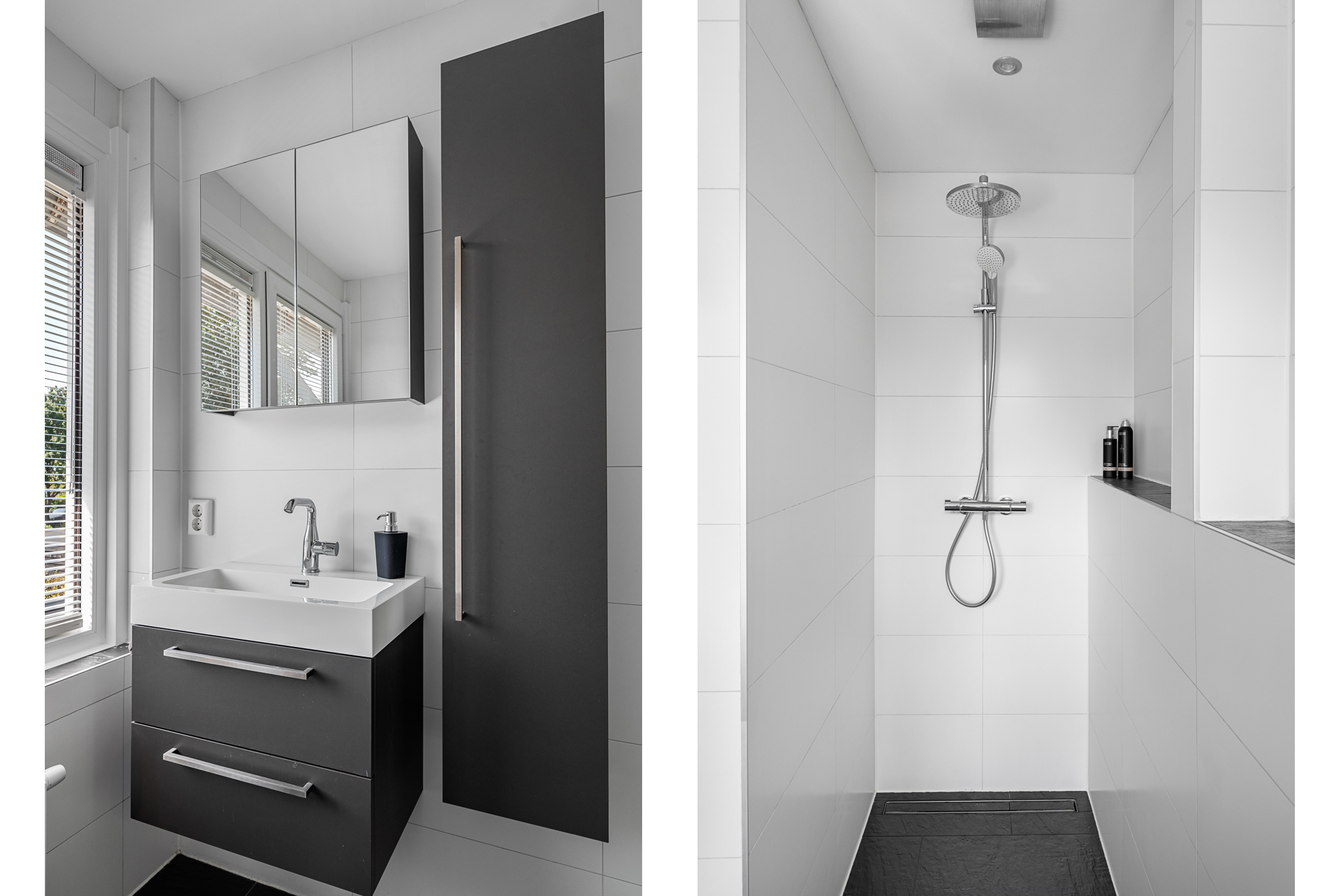 Eerste verdieping: overloop, praktische wasruimte aan de voorzijde van de woning, 2 grote slaapkamers. Stijlvolle badkamer met inloopdouche, tweede toilet en wastafelmeubel.